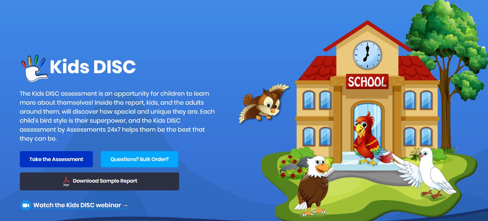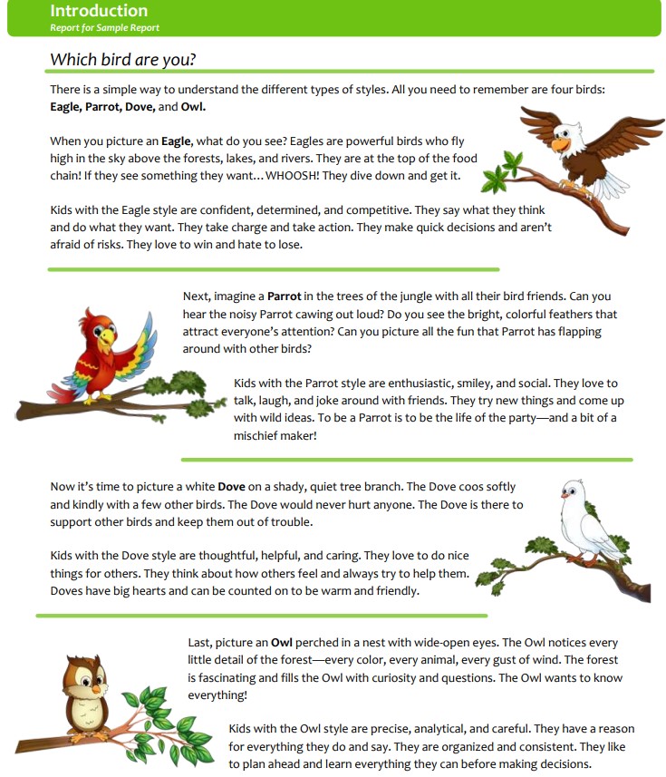 The Kids DISC assessment is an opportunity for children to learn more about themselves! Inside the report, kids, and the adults around them, will discover how special and unique they are. Each child?s bird style (Eagle, Parrot, Dove and Owl) is their superpower, and the Kids DISC assessment helps them be the best that they can be.